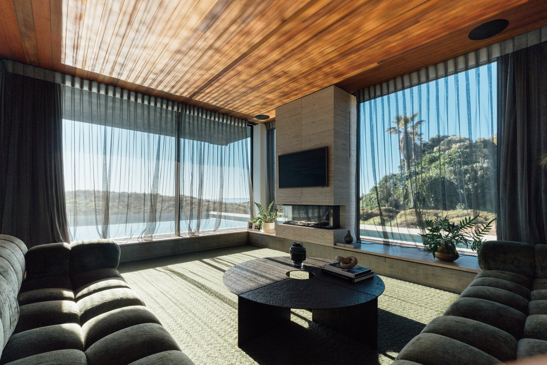 The residence features Japanese Shou Sugi Ban cladding by The Blackwood Project, a sunken lounge, and a wraparound pool — all brought together through natural, Proven materials that ground the home in its coastal setting.